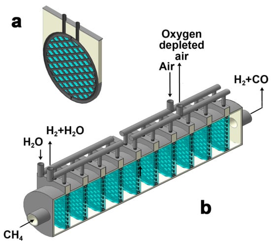 The presented elements can be successively fixed in the tubular reactor, as demonstrated in Figure 9b. Such configuration allows one to combine the production of pure hydrogen from water steam with partial methane oxidation. It is important to note that the latter enables obtaining the heat, which might be expended for the first process. In addition, there is the possibility of joint utilization of membrane materials that are stable at various partial pressures of oxygen. Thus, the use of such reactor plants will make it possible to produce pure hydrogen and synthesis gas.
