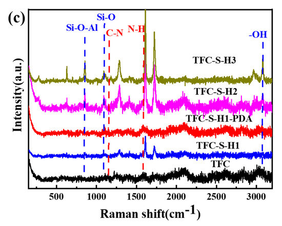 Furthermore, the chemical composition of the polyamide membrane was analyzed by laser confocal Raman spectroscopy, as shown in Figure 1c. First, the Raman peak at 1108 cm−1 corresponds to the C=C stretching vibration of the polyamide. With the addition of SDS−HNTs, the characteristic peak at 860 cm−1 is attributed to the deformation vibration of Si−O−Al, 1144 cm−1 corresponds to the Si−O bond and 3082 cm−1 is the hydroxyl translation of halloysite nanotubes; thus, the characteristic peaks at 860 cm−1, 1144 cm−1 and 3082 cm−1 confirm the successful modification of the polyamide membrane by SDS−HNTs [46]. In addition, the absorption peaks at 1350 cm−1 and 1601 cm−1 correspond to C−N and N−H vibrations in PDA, suggesting the successful formation of a PDA membrane on the surface of the polyamide membrane [47].