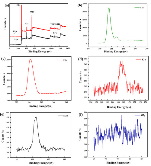XPS diagram of the TFC film and film with 1 wt.% modified material. (a) Total spectrum and (b–f) sub-spectra.