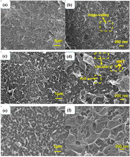 The microstructure of the polyamide membrane modified by SDS−HNTs and PDA is shown in Figure 3. In Figure 3a,b, it can be clearly seen that the polyamide membrane exhibits a typical asymmetric “ridge−valley” structure. With the addition of SDS−HNTs, halloysite nanotubes appear on the surface of the polyamide membrane [50]. At the same time, the “ridge−valley” structure of the polyamide membrane significantly transforms into rod-, circular- and blade−like structures. This is because during the IP reaction process, the substrate surface HNTs can improve the diffusion ability of MPD in the reaction zone and promote MPD dissolution [51]. At the same time, the presence of SDS can disrupt the interface stability during the MPD diffusion process of the IP process, resulting in a rougher and looser PA layer. Therefore, the addition of SDS−HNTs promotes the formation of a highly cross-linked thick PA active layer [52], leading to the tendency of polyamide films with layered structures forming curly leaf-like structures. With 1 wt.% SDS−HNTs, a uniform and small circular structure appears on the surface of the polyamide membrane. With 3 wt.% SDS−HNTs, the blade-shaped structures of the polyamide membrane are easily expanded and form a folded structure, confirming that the curing process of the polyamide membrane is changed by the stronger supporting effect of SDS−HNTs. Thus, it can be deduced that SDS−HNTs have been successfully added into the polyamide membrane, and that the microstructure of the polyamide membrane is changed by the transition of the curing process [53]. In addition, after further modification with PDA, Figure 3e,f shows the formation of a dense PDA layer at the top of the polyamide film, indicating that the structure of the polyamide film has been successfully changed.