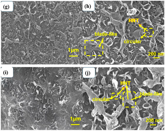SEM images of TFC films at different magnifications and films with different contents of modified materials: (a,b) TFC, (c,d) TFC−S−H1, (e,f) TFC−S−H1−PDA, (g,h) TFC−S−H2, (i,j) TFC−S−H3.