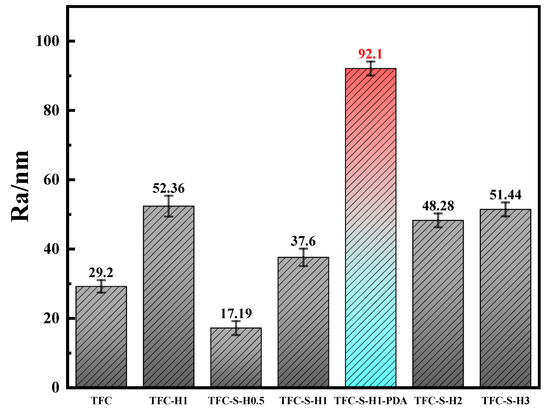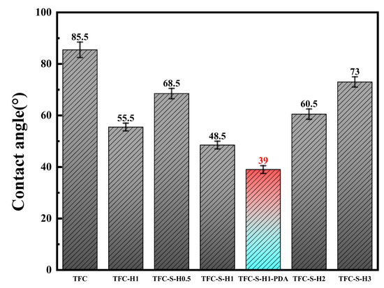 The roughness of a surface directly affects the water contact angle [53]. The water contact angles of the polyamide/polysulfone forward osmosis membrane modified by SDS−HNTs and PDA are shown in Figure 7. With the increase in SDS−HNT content, the contact angle of the polyamide membrane decreases significantly at first and then increases, owing to the clustering of a large amount of SDS−HNTs. With the PDA modification, the contact angle of the TFC−S−H1−PDA polyamide membrane further decreases to 39°, which is about 20% lower than the TFC−S−H1 polyamide membrane. As a consequence, the wettability of the polyamide membrane is improved by the addition of SDS−HNTs rich in −OH groups and PDA rich in −NH3 groups, and the dissolution and diffusion of water molecules on the membrane surface are promoted. The mass transfer resistance is reduced. In addition, the hydrophilic HNTs can absorb water through the capillary effect, further promoting the elevation of the water flux in the polyamide membrane [15].