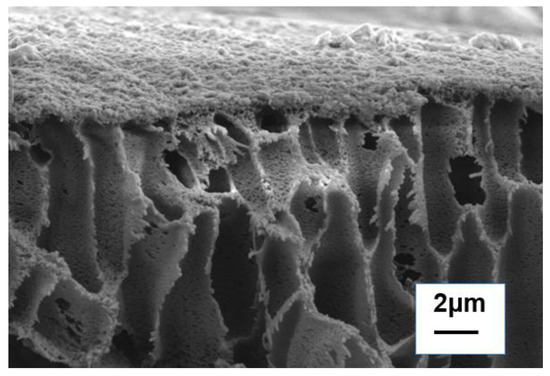 Figure 6 shows the cross-sectional morphology of the TFN−S−H1 membrane. Firstly, in the polysulfone layer of the forward osmosis membrane, the orderly arranged finger-like structure provides an effective water channel. Secondly, a polyamide layer can be clearly observed on the surface of the polysulfone. There are numerous convex structures on the surface of the polyamide, which may be due to the wrinkle structure induced by the addition of SDS−HNTs. Therefore, the modification of halloysite SDS−HNTs and PDA significantly improves the microstructure of the polyamide membrane, which is conducive to improving its permeability.