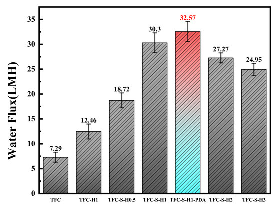 The application of polyamide forward osmosis membranes is directly affected by permeability. Thus, the water fluxes of the polyamide/polysulfone forward osmosis membrane modified by SDS−HNTs and PDA are shown in Figure 8. First, the water flux of the TFC polyamide membrane is only 7.29 Lm−2h−1, restricting its application in emergency rescue. With the addition of HNTs, the water flux of the polyamide membrane increases rapidly. Furthermore, with the addition of SDS−HNTs, the water flux of the TFC−S−H1 polyamide membrane increases to 30.3 Lm−2h−1, which is approximately 4 times higher than TFC. Nevertheless, a higher amount of SDS−HNTs are aggregated in the polyamide membrane, leading to a decrease in the water flux. In addition, when the polyamide membrane modified by SDS−HNTs is further modified by PDA, the water flux of the TFC−S−H1−PDA polyamide membrane increases to 32.57 Lm−2h−1, which is 2.27 Lm−2h−1 higher than that of the TFC−S−H1 polyamide membrane. Therefore, hydrophilic groups such as the hydroxyl, carboxyl and phenolic groups of PDA not only change the interface properties of the polyamide membrane, but also form a dense PDA nanoparticle membrane, thereby increasing the surface roughness and the hydrophilicity of the polyamide/polysulfone forward osmosis membrane. Hence, the synergistic effect of SDS−HNTs and the dense PDA nanoparticle membrane significantly improves the water flux of the polyamide/polysulfone forward osmosis membrane, improving its effect in emergency rescues.