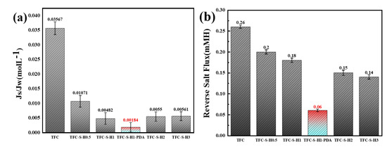 The reverse salt flux and Js/Jw of TFC−S−H modified membrane: (a) the reverse salt flux, (b) Js/Jw.