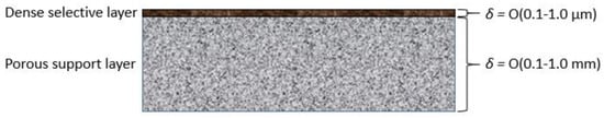 High-performance polymeric membranes typically consist of a thick, dense submicron layer on top of a porous support, as shown in Figure 1. Ideally, the support provides mechanical support to permit the imposition of a pressure difference across the membrane without damaging it but does not pose significant resistance to permeation. Membrane permeation rates are controlled by the material comprising the dense layer, and the value of d in Equation (1) is equal to the effective thickness of this layer. Direct measurement of the layer thickness is often difficult. However, the value can be estimated from permeation rates measured for both the supported membrane and thicker samples of a dense unsupported membrane.