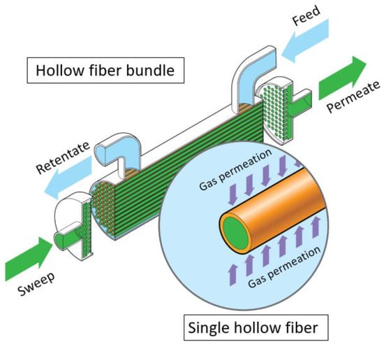 Graphic depiction of a hollow-fiber membrane module. In this configuration, the feed stream (blue) is introduced into the shell side and runs countercurrent to the sweep stream (green) introduced into the tube side (fiber lumens). The gas of interest for the separation (e.g., CO2 or O2) permeates from the feed side through the hollow-fiber membrane to the permeate side.