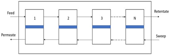 Under these assumptions, the model for an “ideal” module consists of a set of differential mass balances that describe the concentration profiles of each component along the length of the module. Following Coker et al. [23], these equations can be solved by dividing the module length into a series of N well-mixed, as illustrated in Figure 7.