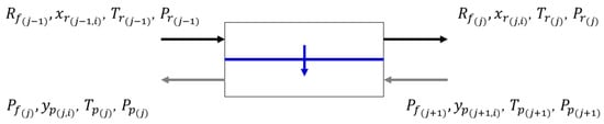 where xr and yp are the mole fractions of component in the retentate and permeate flows, respectively; and the subscripts j − 1, j, and j + 1 indicate the stage that the flow comes from.