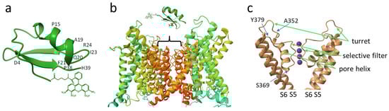 - Zhao, Y.; Chen, Z.; Cao, Z.; Li, W.; Wu, Y. Diverse Structural Features of Potassium Channels Characterized by Scorpion Toxins as Molecular Probes. Molecules 2019, 24, 2045. [Google Scholar] [CrossRef]