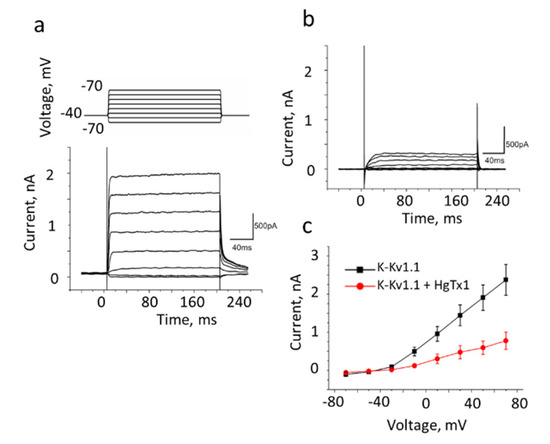 The conductivity of the K-Kv1.1 channel in Neuro2a cells was characterized by the patch-clamp technique in the whole-cell configuration. Potassium currents with rapid activation and slow inactivation were detected (Figure 4a), similar to the typical currents of rodent and human Kv1.1 channels [33,34,35]. The measured dependence of the current on the applied voltage revealed a positive current threshold in cells expressing K-Kv1.1 at a potential above −30 mV and an increase in the current amplitude that is proportional to the voltage in the range from −30 to 70 mV (Figure 4a,c). The 2–4 nA outward current was detected at 70 mV in cells expressing K-Kv1.1 (Figure 4a). The application of HgTx1 (2 nM), the high-affinity peptide blocker of the Kv1.1 channel [36], caused a decrease in the peak current amplitude by 73 ± 8% (n = 10) at an applied voltage varying from −10 to 70 mV (Figure 4b,c). In non-transfected Neuro2a cells, outward voltage-dependent ion currents are low (0.1–0.2 nA) to interfere noticeably with the K-Kv1.1-related currents in the transfected cells (Figure S4 and published data [23]). These “background” currents are not related to Kv1 channels because they are insensitive to the application of Kv1-channel blockers ChTx [23] and HgTx1 (Figure S4). At least in part, the “background” currents are responsible for residual currents after the addition of HgTx1 to cells expressing K-Kv1.1 (Figure 4b,c).