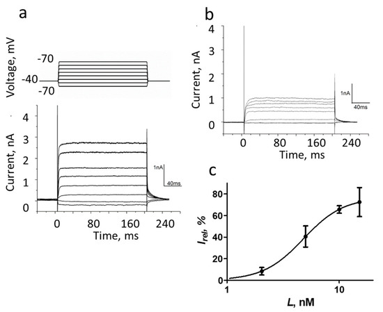 The whole-cell recording of currents in Neuro2a cells expressing K-Kv1.1 in the absence (a) or after the addition of 5 nM A-HgTx (b). The membrane potential was changed from −70 to +70 mV in increments of 20 mV using 200 ms pulses (as shown in the insert at the top of panel (a)) that were applied at 20 s intervals. Finally, the potential returned to the holding potential (−40 mV). Representative series of currents are shown. (c) Dependence of inhibition of K-Kv1.1 current on the concentration of A-HgTx at +50 mV. Data are mean ± SEM (n = 6).