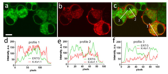 Confocal images showing distributions of K-Kv1.1 (a) and ER marker ERTG (b) in living Neuro2a cells. (c) Merged image. Yellow color shows the co-localization of K-Kv1.1 and ERTG in ER. Scale bar is 10 µm. (d–f) Profiles of ERTG and K-Kv1.1 fluorescence distribution along white lines marked in panel (c).