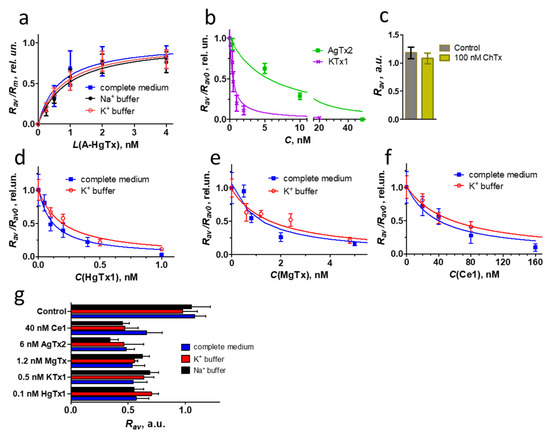 Quantitative analysis of K-Kv1.1 interactions with different peptide pore blockers. (a) Concentration-dependent binding of A-HgTx to K-Kv1.1, which was measured as the dependence of Rav on the concentration L of A-HgTx added to Neuro2a cells and normalized to the maximum Rav value (Rm). Measurements were performed in a complete medium or a buffer with either 150 mM KCl (K+ buffer) or 4 mM KCl and 150 mM NaCl (Na+ buffer). The complete medium and Na+ buffer maintains the closed state of the channels, while the K+ buffer favors the open state of the channels. (b,d–f) Competitive binding of A-HgTx (2 nM) and different peptide pore blockers to K-Kv1.1. C—concentration of non-labeled peptide pore blocker. Representative dependencies are shown. Measurements were performed in a complete medium (b,d–f) or in a K+ buffer that favored the open state of the channels (d–f). (c) ChTx (100 nM) is not able to compete with A-HgTx (2 nM) for binding to K-Kv1.1. Control—binding of A-HgTx (2 nM) to K-Kv1.1 in the absence of ChTx. (g) Competitive binding of A-HgTx (2 nM) and different peptide pore blockers (concentrations are indicated in the diagram) to K-Kv1.1 in a complete medium, K+ and Na+ buffers. Concentrations of peptide pore blockers were selected to displace 45–60% of A-HgTx from the complexes with K-Kv1.1 in a complete medium.