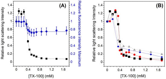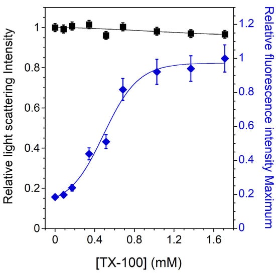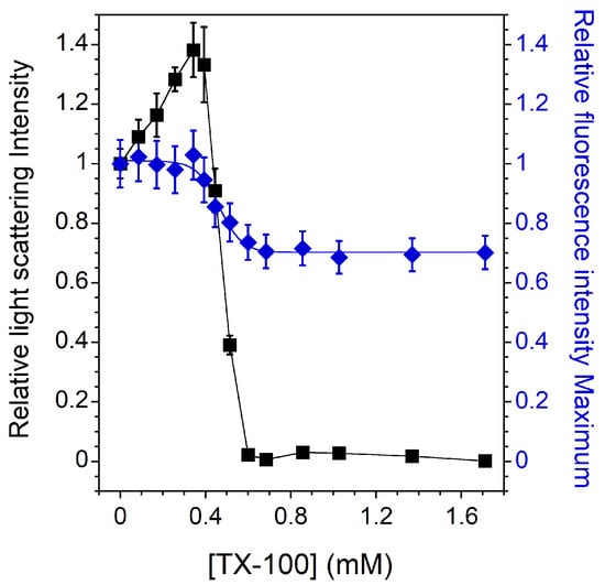 Figure 1 shows the relative light scattering intensity and the CNBD-PC fluorescence intensity maximum of pure PC vesicles as a function of the detergent concentration. The intensities shown in Figure 1 are relative to the initial values of light scattering and CNBD-PC fluorescence intensities obtained in the absence of TX-100. For PC LUVs in the Ld phase at 20 °C ( around −5 °C [49]), the three stages of solubilization are very well defined. First, during the incorporation of TX-100 into the vesicles, an increase in the relative light scattering intensity is observed, which could indicate an initial swelling of the liposomes and/or some fusion events. At the same time, there is no significant change in the relative CNBD-PC fluorescence intensity maximum, indicating that the environment of the probe embedded in the bilayer does not change significantly [42]. Then, the light scattering intensity of the sample steadily decreases as lipids and detergents are gradually transferred from LUVs to mixed micelles. During this process, the emitted fluorescence maximum also decreases. Indeed, the vesicle-to-micelle transition results in greater penetration of water molecules into more curved mixed micelles, thereby increasing the polarity in the NBD environment with a consequent decrease in NBD fluorescence intensity [50]. Finally, the relative light scattering reaches almost zero, indicating that the solubilization is complete and that only mixed micelles are present. At this stage, the CNBD-PC relative fluorescence intensity maximum remains constant, indicating that the environment of the probe embedded in the mixed micelles is no longer changing.