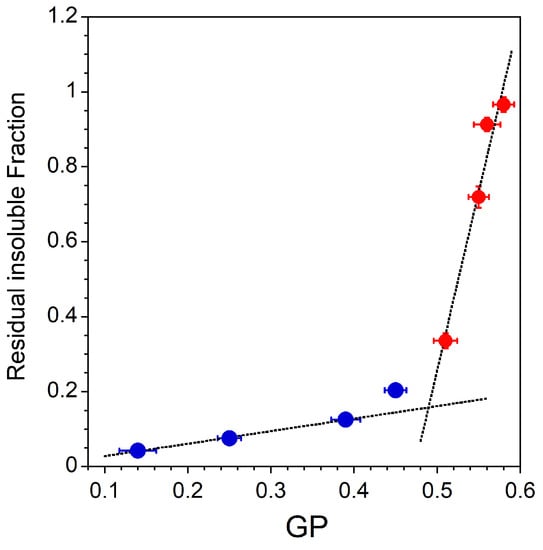 Residual insoluble fractions corresponding to light scattering intensities measured at the highest detergent to lipid ratio (•: Lo-Ld mixtures, Figure 2B; •: Lo and dLo mixtures, Figure 4A) vs. GP values measured without TX-100 (Table 1 and Table 2, ). The RIF error bars are shown for values that have been measured three times and the GP error bars are shown for values measured in two sets of five measurements. All measurements were performed at a lipid concentration of 0.1 mM and were recorded at 20 °C.