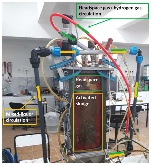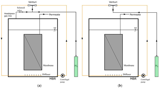 A new MBR configuration has been developed that increases the solubility of hydrogen gas in the MBR and reduces membrane fouling [27]. In this configuration, the activated sludge suspension is circulated through a venturi injector with the headspace gas and then returned to the reactor. The cavitation in the venturi increases gas transfer, while a diffuser directs the liquid–gas mixture to the membrane surface for better scouring. However, the effect of headspace gas circulation or the means of circulation, whether by a venturi device or peristaltic pump, on membrane fouling and denitrification process performance was not studied, although MBR configuration was partly the same.