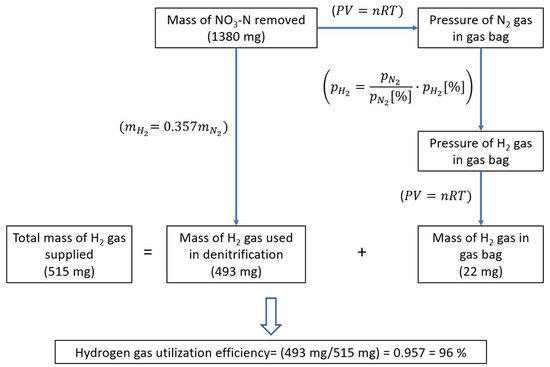 Hydrogen gas utilization efficiency was calculated approximately by a mass balance of H2 gas, assuming no accumulation of intermediate products. That is, the total mass of the H2 gas supplied to the reactor within a certain period should be equal to the sum of the mass of unused H2 gas accumulated in the gas bag and the mass of the H2 gas used to convert nitrate to nitrogen gas. The mass of H2 gas used to convert nitrate to nitrogen gas is equal to 0.357 times the mass of converted to nitrogen gas, according to the general conversion stoichiometry of hydrogen-based denitrification (Equation (1)). After measuring the mass of H2 gas in the gas bag and calculating the mass of the H2 gas used for converted to nitrogen gas; the ratio of the latter to their sum shows the efficiency of hydrogen gas utilization.