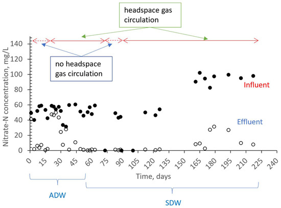 As seen in Figure 5, during the first period (days 17–56), when the headspace gas circulation was applied, the effluent concentration dropped below 10 mg/L from the 45th day, and the removal efficiency increased up to 98%. When the inflow concentration was increased to 100 mg/L, the effluent concentration initially rose to 31.5 mg/L, but then fell to 7.9 mg/L (Figure 5). The maximum removal efficiency of 92% was achieved at a concentration of 100 mg/L.