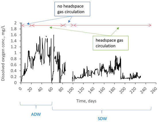 Dissolved oxygen concentration in an anoxic MBR during operation with/without headspace gas circulation.