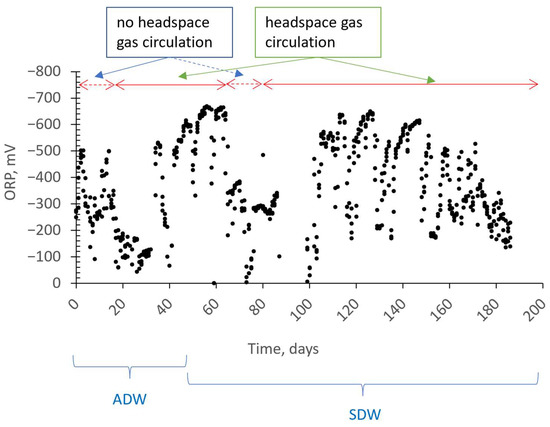 Oxidation–reduction potential in an anoxic MBR during operation with/without headspace gas circulation.