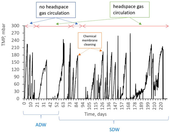 When the headspace gas was taken with a peristaltic pump instead of a venturi, given to the activated sludge circulation line and recycled, the membrane fouled more rapidly (Figure 9). Figure 8 shows that during the period of synthetic drainage water, chemical membrane cleaning was performed every 12 days on average, including technical problems. However, when the venturi device was not used, it was observed that chemical cleaning of the membrane was required every 1–2 days, even if the headspace gas was recycled. This result highlights the importance of ensuring a sufficient velocity of liquid–gas flow used in scouring the membrane surface to limit membrane fouling. The use of a venturi device appears to be an effective way to achieve this goal.