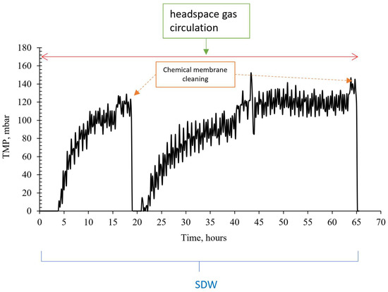 Figure 8 shows the effect of headspace gas recirculation on the change in transmembrane pressure (TMP). In the absence of headspace gas circulation in an anoxic MBR, the membrane surface was only cleaned with liquid flow. However, chemical cleaning was required after an average of 5 days, since more than a 20% decrease in membrane flux was observed. In contrast, when the headspace gas circulation was present, the gas accumulated in the upper part of the reactor was vacuumed by the venturi and the resulting bubbled liquid–gas stream was used to continuously scour the membrane surface. It was observed that the TMP of the membrane, which was chemically cleaned on average every 5 days before, did not increase for 5 days, and the need for chemical washing occurred after 18 days on average.