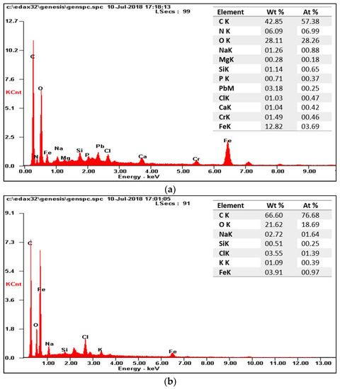 EDS graphs of a (a) fouled and cleaned (b) membrane.