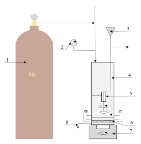 Schematic diagram of the filtration cell: 1—gas cylinder (helium), 2—manometer, 3—liquid supply system to the cell, 4—filtration cell, 5—magnetic anchor, 6—membrane, 7—magnetic stirrer, 8—sampler.