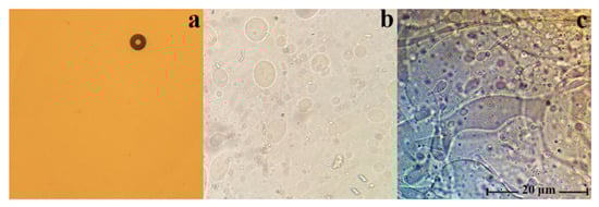 Micrographs of 18 wt.% solutions cellulose with PAN in NMMO, the ratio of polymers in solution: 100:0 (a), 90:10 (b), and 80:20 wt.% (c).