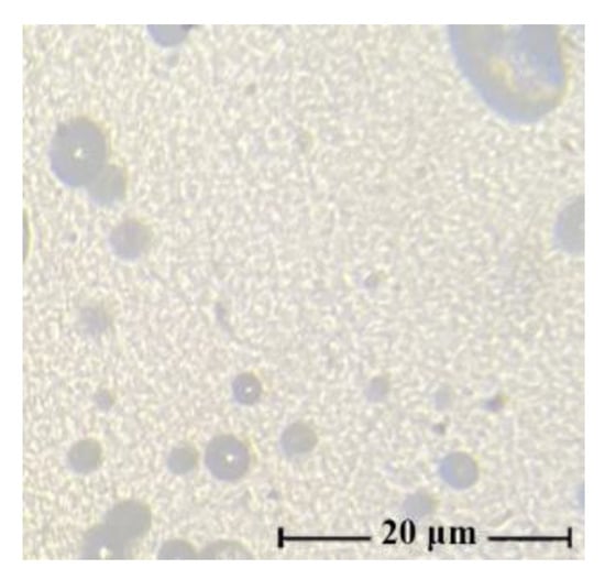 In such cases (as can be seen from the figure), the morphology of the mixture solutions varies from the drop solution, with an average droplet size of several microns for systems with low additive content (up to 10 wt.%), to randomly distributed extended structures (dispersed phase), with a PAN concentration in solution of more than 20 wt.%. With intensive mixing of a two-phase solution, the morphology of the system changes dramatically. Depending on the content of PAN in the solution, it varies from a fine droplet to an interpenetrating morphology. Figure 3 shows a micrograph of a solution containing 40 wt.% PAN.