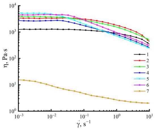 Flow curves of 18 wt.% solutions of cellulose (1), PAN (7), and mixed solutions of cellulose-containing 10 (2), 20 (3), 30 (4), 40 (5), 50 wt.% (6) PAN in NMMO at 120 °C.