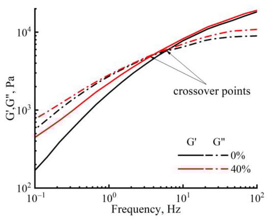 In Figure 5 the dependence of the modulus of elasticity and the loss modulus on the oscillation frequency at a temperature of 120 °C (for cellulose solutions with different PAN content), an increase can be observed in the values of both moduli with increasing frequency. The introduction of PAN in small quantities does not affect the viscoelastic properties, but with an increase in its concentration up to 40 wt.%, the shift of the crossover to the lower frequencies takes place. This means an increase in the elastic response of the mixed solutions compared with the cellulose solution. Therefore, the rheological behavior of mixed solutions is determined by their prehistory (morphology) and temperature.