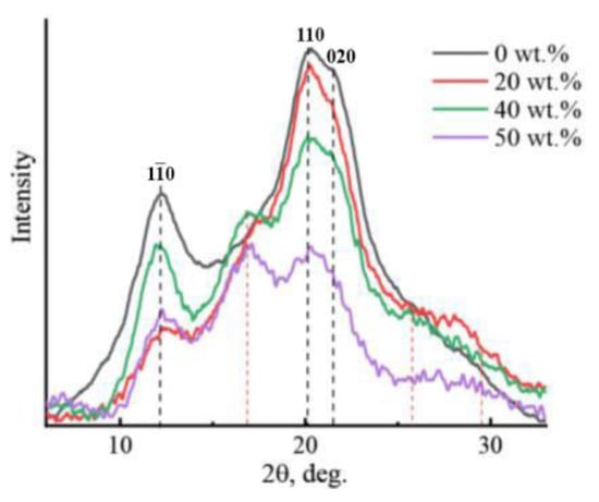 As can be seen from Figure 7, for the obtained cellulose films, the main reflexes (marked in Figure 7) are in the typical cellulose allomorph II position (2θ~12.1°, ~20.1°, and ~21.5°) (planes 1–10, 110, and 020) [11,36]. For PAN, the diffraction patterns show reflections in the regions 2θ = 16.9°, 2θ = 29.4°, and a broad reflection in the region 25.7° [28], marked with a red dotted line. Interestingly, the introduction of PAN into cellulose in an amount of up to 5 wt.% does not lead to a significant change in the form of diffraction patterns; only reflection characteristics of cellulose are observed on them [30]. The behavior of the curves for composite membranes with a PAN content of up to 20 wt.% is similar. With a further increase in the PAN content in the system above 20 wt.%, characteristic PAN reflections begin to appear in the diffraction patterns. Inclusion into the cellulose matrix of PAN does not entail changes in the angular positions of the main cellulose reflexes. The intensity of the reflexes decreases with an increase in the concentration of the terpolymer in the system. On the contrary, the intensity of the characteristic PAN reflex in the region 2θ~16.9° (marked in Figure 7 with a red dotted line) increases, reaching its maximum values with an equal ratio of the components. Thus, a decrease in the concentration of cellulose on one side and an increase in the proportion of PAN in the system on the other leads to a decrease in the degree of ordering of the cellulose matrix. For the obtained diffraction patterns of composite membranes, the interlayer distance does not change, which allows us to speak about the degree of interaction between cellulose and PAN.