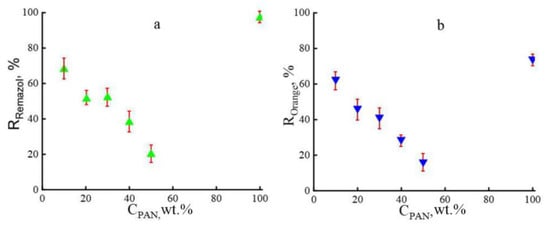 In contrast to cellulose membranes, composite membranes, regardless of the PAN content in the system, showed the best separating characteristics when the model substances were removed from ethanol. The Orange II rejection decreases with increasing PAN content in the system by up to 50 wt.%. However, even with such a strong decrease in Orange II rejection, the observed values are 2–2.5 times higher compared to cellulose membranes (5–8%) [11]. This decrease in Orange II rejection is likely due to an increase in the number of pores and total free volume in the membrane. A slightly different picture is observed for Remazol: an increase in the terpolymer content in the cellulose matrix to 30 wt.% is accompanied by a moderate decrease in rejection. A further increase in PAN in the system by up to 50 wt.% leads to a decrease in rejection values by almost doubling. With an equivalent ratio of components, the rejection of Remazol is about 20%.