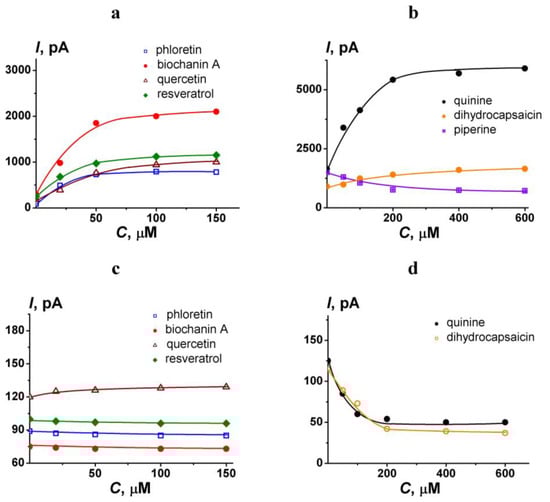 The dependence of transmembrane current induced by amphotericin B on the concentration of different polyphenols (a,c) and alkaloids (b,d). Membranes were formed from POPC/ERG (67/33 mol.%) (a,b) and POPC/CHOL (67/33 mol.%) (c,d) and bathed in 2.0 M KCl pH 7.4. The transmembrane voltage was 50 mV.