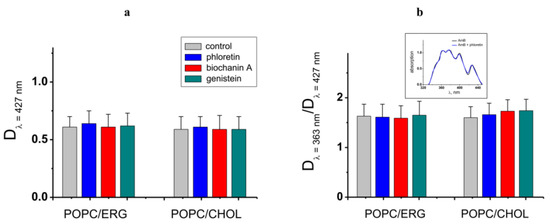 (a) Amphotericin B absorbance at 427 nm characterizing the antibiotic concentration in POPC/ERG (67/33 mol.%) and POPC/CHOL (67/33 mol.%) liposomes in the absence and presence of phloretin, biochanin A, and genistein. (b) The ratio of amphotericin B absorbance at 363 and 427 nm characterizing the balance between self-associated and monomeric antibiotic forms in the distinct lipid microenvironment in the absence and presence of phytochemicals. Inset: The representative amphotericin B absorbance spectrums in the absence (control) and presence of phloretin in the POPC/ERG (67/33 mol.%) vesicles.
