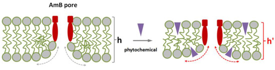 One can notice that addition of phloretin, phlorizin, cardamonin, naringenin, taxifolin, biochanin A, resveratrol, 4′-hydroxychalcone, licochalcone A, butein, curcumin, quinine, colchicine, piperine, and dihydrocapsaicin led to a decrease in Tm and an increase in ∆Tb by more than 0.5 °C. Catechin, quercetin, and genistein slightly affected lipid melting temperature, but demonstrated a significant effect on phase transition peak width. Diminishment of the temperature and/or cooperativity of lipid melting indicated the disordering action of the tested phytochemicals on the membranes. More probably, these plant molecules are able to absorb on the membrane and intercalate between lipid heads, increasing the area per lipid molecule and causing membrane disordering. This suggests that the phytochemicals reduce the energetic cost of bilayer deformation. Thus, the action of phytochemicals on the lipid packing might explain the potentiating effects of phloretin, phlorizin, naringenin, taxifolin, biochanin A, resveratrol, quinine, and dihydrocapsaicin. The schematic representation of potentiating AmB pore formation by embedding of the phytochemicals between lipid heads into hydrophilic regions of the lipid bilayer is shown in Figure 6. A similar explanation was applied by Ingolfsson et al. to elucidate the alteration in gramicidin A pore-forming ability by capsaicin, curcumin, genistein, and resveratrol [48].