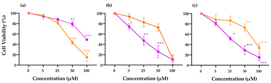 Viability effect of peptides ΔM4 (-■-) and LTX-315 (-●-) at 0, 5, 25, 50, and 100 µM on (a) non-tumoral HaCaT cells, (b) A375 melanoma cells, and (c) A431 carcinoma cells. The differences with respect to non-treated cells were obtained by one-way ANOVA where * p ≤ 0.05, ** p ≤ 0.01, *** p ≤ 0.001.