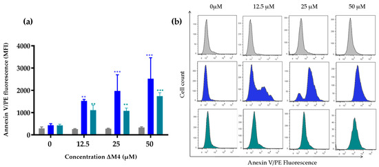 ) cells were treated with ΔM4 peptide for 24 h at different concentrations (12.5, 25, and 50 µM), and subsequently stained with annexin-PE and analyzed by flow cytometry. (a) The bar chart indicates an increase in fluorescence related to the expression of PS. (b) The flow cytometry histograms of annexin V/PE fluorescence intensities plotted against cell counts obtained from the analysis of untreated cells and cells treated with ΔM4 (12.5, 25, and 50 µM). Three independent experiments were conducted and results of one representative experiment are reported. Using one-way ANOVA, the differences were obtained with respect to non-treated cells, where **p ≤ 0.01, *** p ≤ 0.001.