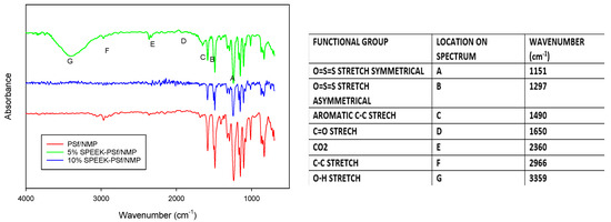 The FTIR spectra of a PSf/NMP membrane and both 5% and 10% SPEEK-PSf/NMP composite membranes are shown in Figure 3. The strong absorption peaks around 1490, 1151, and 1297 cm−1 correspond to the aromatic backbone and symmetric O=S=O and asymmetrical O=S=O stretching, respectively, that can be observed in both PSf and SPEEK. The vibration of the carbonyl functional group C=O was observed at 1650 cm−1 [55]. This differs from the 1750 cm−1 often observed in the literature due to shifting associated with conjugation between the aromatic ring and the phenolic oxygen observed in the backbone of both PSf and SPEEK [56]. In contrast to the PSf/NMP membrane, the 5% SPEEK-PSf/NMP membrane exhibited a broad band in the high energy region around 3359 cm−1 corresponding to the OH functional group [55] of the SO3H group associated with the incorporation of SPEEK into the membrane matrix. The same peak should be observed in 10% SPEEK-PSf/NMP membranes; however, the spectrum seemed identical to that of PSf/NMP membranes. This was hypothesized to potentially be a result of the following: while the SO3H functional groups may have been introduced into the membrane matrix, they may not have been localized on the surface.