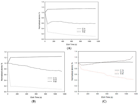 XPS depth profile spectra for membranes PSf/NMP in (A), 5% SPEEK-PSf/NMP in (B), and 10% SPEEK-PSf/NMP in (C). Each membrane was etched for over 1100 seconds, and points were taken after each level of etching.
