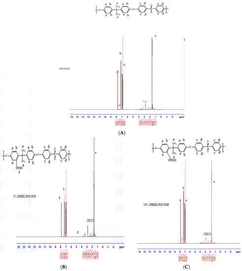 NMR spectra of (A) PSf/NMP, (B) 5% SPEEK-PSf/NMP, and (C) 10% SPEEK-PSf/NMP membranes prepared in deuterated chloroform.