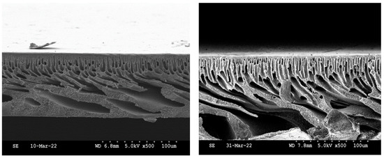 Cross-sectional SEM images of PSf/NMP (left) and SPEEK-PSF/NMP (right) membranes. Cry rapture was utilized to obtain cross-sectional images.