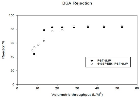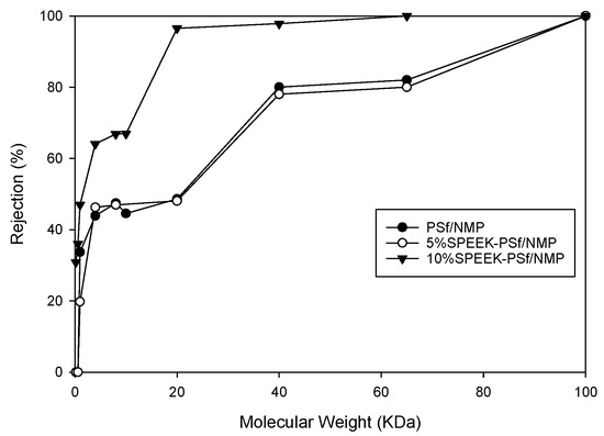 The average pore size of the 5% SPEEK-PSf/NMP membrane was measured to be approximately 0.05+/−0.024 microns, which was larger than that of the PSF/NMP membrane (0.04+/−0.012 microns). This agreed with the surface images obtained from SEM where the pores appeared to be larger in the composite membrane than the control. This was further reinforced by the MWCO measurements (molecular weight at which 90% of the macromolecular solute is rejected by the membrane [60]). From MWCO measurements, as observed in Figure 7, both SPEEK-PSf/NMP membranes and PSf/NMP membranes were within the ultrafiltration range. Increasing the percentage of SPEEK incorporated into the membrane matrix from 5% to 10% reduced the MWCO of membranes. For a membrane in the UF/NF range, an increase in MWCO can lead to an increase in permeability and a decrease in percentage rejection and vice versa [61].