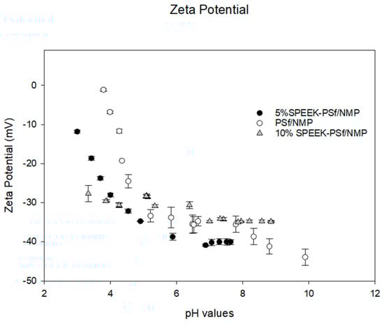 For membranes to be competitive, they are often required to be solvent resistant, durable, and have a long shelf life. This leads to the use of polymers with higher hydrophobicity properties that are prone to fouling and, hence, decreased membrane performance [27]. By increasing the sulfonation and hydrophilicity, as shown in Figure 8, the charge increases, hence improving its performance [62]. Figure 8 shows the pH dependence of the membrane’s zeta potential. Here, 5% SPEEK-PSf/NMP membranes illustrated an overall more negative charge across all pH values that were evaluated. This showed that the introduction of just the 5% SPEEK polymer into the membrane matrix greatly influenced the charge distribution of the membrane. The addition of a higher percentage of the SPEEK polymer should theoretically also further increase the zeta potential; however, upon investigation, it was observed that at lower pH values of 3 to 4, the membrane with 10% SPEEK was more negatively charged, and the charge became more positive than that of 5% SPEEK as the pH increased. This could be attributed to the fact that more of the charge was introduced within the membrane pores rather than only on the surface, as indicated by the depth profile in Figure 4.