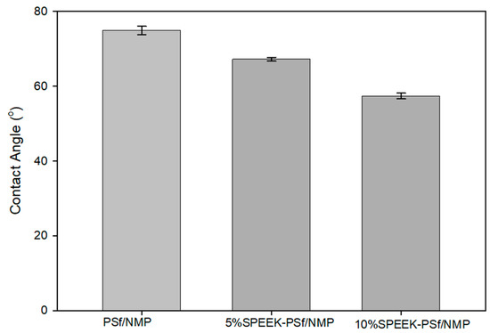 Contact angle measurements of PSf/NMP, 5% SPEEK-PSf/NMP membranes, and 10% SPEEK-PSf/NMP membranes obtained using the sessile drop method.