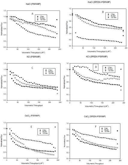 Backflow was carried out to evaluate the potential for the reuse of the membrane after salt filtration. The results showed that after washing, the membrane flux was restored back to pre-compaction levels for the 5% SPEEK-PSf/NMP membranes. This indicated that the 5% SPEEK-PSf/NMP membranes had the potential to be reused. On the other hand, the backwash of PSf/NMP membranes did not improve the flux. This indicated that compared to the 5% SPEEK-PSf/NMP membranes, the PSf/NMP membranes had less potential of being reused after salt filtration. Similar results were obtained for KCl and CaCl2 salts, which are also observed in Figure 15. This indicated that regardless of the ionic radii of the salt, an application of an external potential to the surface of the negatively charged 5% SPEEK-PSf/NMP membranes improved the performance of that membrane in the repulsion of the charged species.