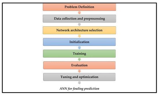 ANNs are developed through a process known as training, which involves adjusting the weights and biases of the network to minimize the difference between the predicted output and the actual output for a set of training examples [86]. The steps are summarized in Figure 3. The first step in developing an ANN is to define the problem that the network will be used to solve. This involves specifying the input variables (e.g., operating conditions, feed characteristics, and membrane characteristics) and the output variable (e.g., fouling rate, and flux decline). Once the problem is defined, data must be collected and preprocessed. This involves cleaning the data to remove any inconsistent or outlier data and then splitting the data into a training set (used to train the network) and a testing set (used to evaluate the network’s performance). Next, the network architecture must be selected based on the problem and the available data. This involves deciding the number of layers and nodes in each layer, as well as the activation functions to be used. The weights and biases of the network are initialized randomly before training begins. During training, the network is presented with a set of input–output pairs from the training set, and the weights and biases are adjusted using an optimization algorithm (e.g., backpropagation) to minimize the difference between the predicted output and the actual output. After training is complete, the performance of the network is evaluated using the testing set. If the performance is satisfactory, the network can be used for predictions on new data. Finally, the network can be fine-tuned and optimized by adjusting the network architecture, training parameters, and preprocessing methods to improve performance [68,86].