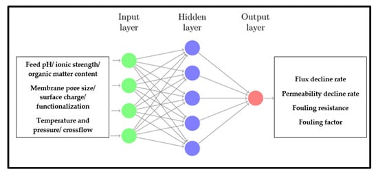Several research studies [59,60,61] have utilized smart models to predict membrane fouling indices such as transmembrane pressure (TMP) or membrane permeate flux. These models are based on AI and aim to provide higher accuracy than mechanistic models while at the same time eliminating the need for model calibration. ANNs have been widely used for fouling prediction in membrane filtration systems. Input parameters include feed water quality, operating conditions, and membrane properties. ANNs have several advantages that make them a popular and effective choice for fouling prediction, including [62,63]: (1) the nonlinear modeling capability to capture nonlinear relationships between input and output variables [64], (2) the ability to effectively handle high-dimensional data involving a large number of input parameters, (3) generalizability, as ANNs can be trained on a dataset and then used to predict fouling for new input parameters that were not present in the training set, making them useful for real-time fouling prediction in industrial applications, and (4) flexibility, as they can be easily adapted to different fouling prediction tasks by adjusting the network architecture and input parameters [65].